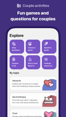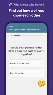 🎮 Games: Lighten up with playful challenges! From testing how well you know each other to deciding 'You or me' in different scenarios, our games are all about fun and understanding without the pressure of right or wrong.