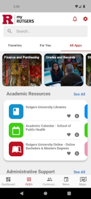 myRutgers university portal available for Android mobile devices. Access the university on the go: my Dashboard of personalized information, my Apps links to online services, my Maps to check campus building and bus location, my New for Rutgers news, and join my Community for online discussions, collaboration, communications, and event calendar.
