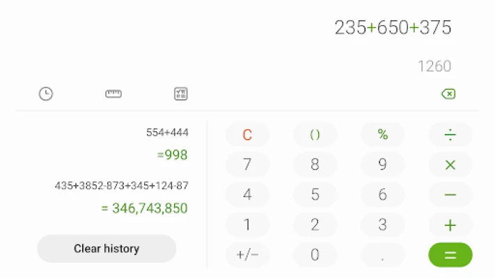 To check the calculation history, tap the calculation history icon. To close the calculation history panel, tap the keypad icon.